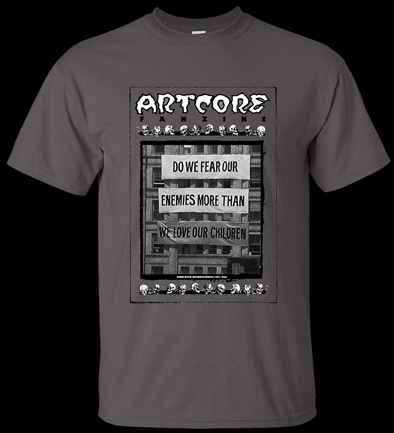 The cover of the new issue (without the band names) but bearing the legend; "Do We Fear Our Enemies More Than We Love Our Children". High quality print on Gildan Ultra shirts. Available in Small, Medium, Large or XL