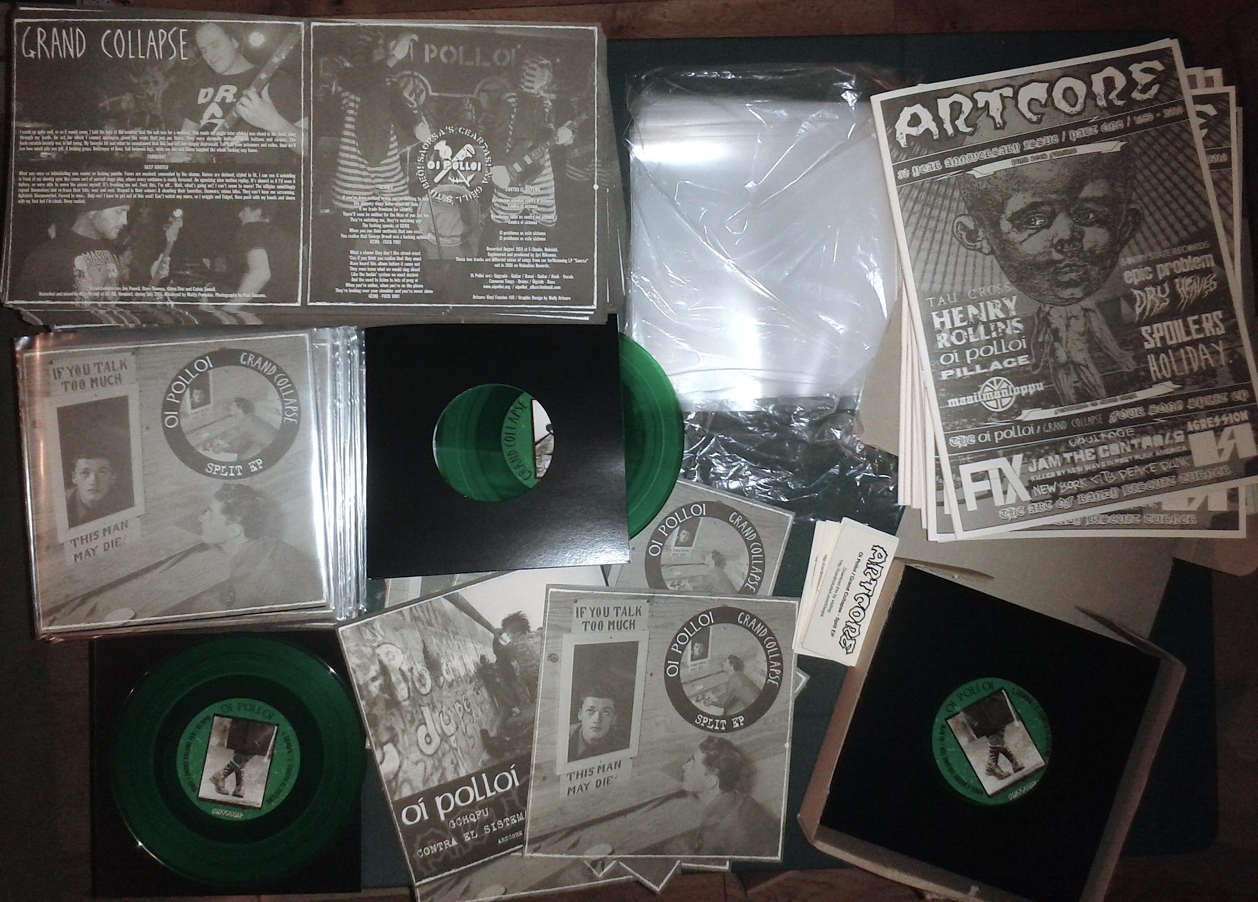 With the OI POLLOI / GRAND COLLAPSE four song 7" EP on green vinyl